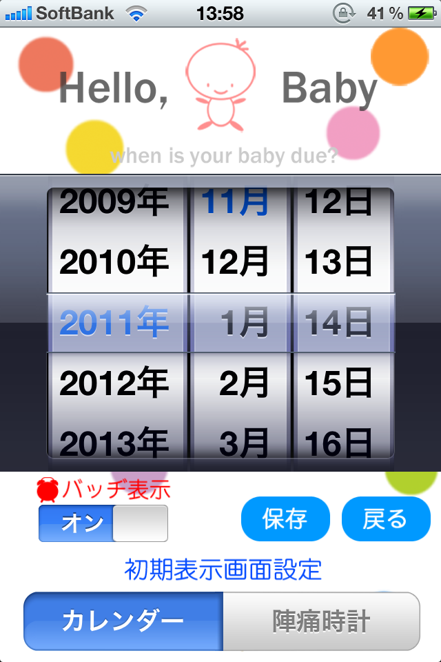 妊婦の方、そして旦那さんにも役立つ マタニティライフを応援するアプリです。 出産予定日を設定するだけで、 ◆出産予定日 ◆予定日まで何日? ◆いま何週? ◆いま何ヶ月? をひと目で確認できます。 そして出産予定日の30日前から、 アイコンバッジを表示し、 カウントダウンしてくれるので、 アプリを起動する必要もありません。 (バッヂの表示・非表示は設定できます。) 新機能として ◆陣痛時計 を実装いたしました。 ボタン一つの簡単操作で 陣痛の起こった日時と陣痛の起こった間隔、 陣痛の継続時間の計測が可能です。 また、設定画面でアプリ起動時の画面をカレンダーにするか 陣痛時計にするかの設定も可能です。 このアプリが、 少しでもあなたのマタニティライフの お役に立てればうれしいです。