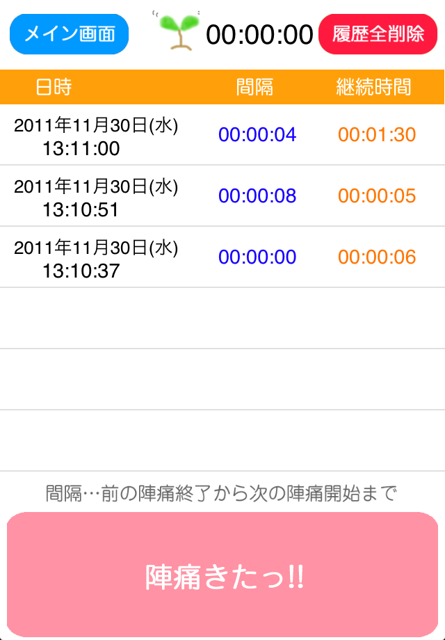 ボタン一つの簡単操作で 陣痛の起こった日時と陣痛の起こった間隔、陣痛の継続時間の計測が可能です。