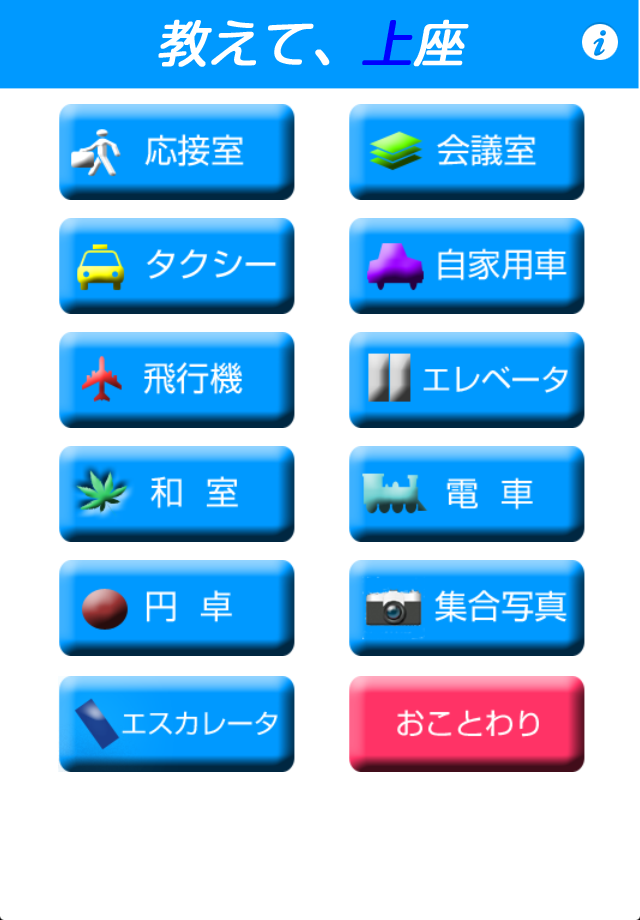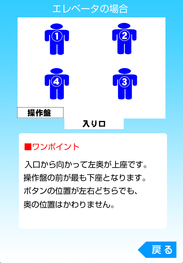 このアプリケーションは、ありがちなシチュエーションでの上座の位置をすぐに確認できる便利なアプリケーションです。圏外にいたとしても問題ありません。